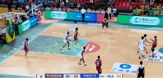 比賽第三節(jié),強(qiáng)硬張洪碩突破強(qiáng)硬上籃打進(jìn),上籃浙江三節(jié)71-65領(lǐng)先新疆。打進(jìn)