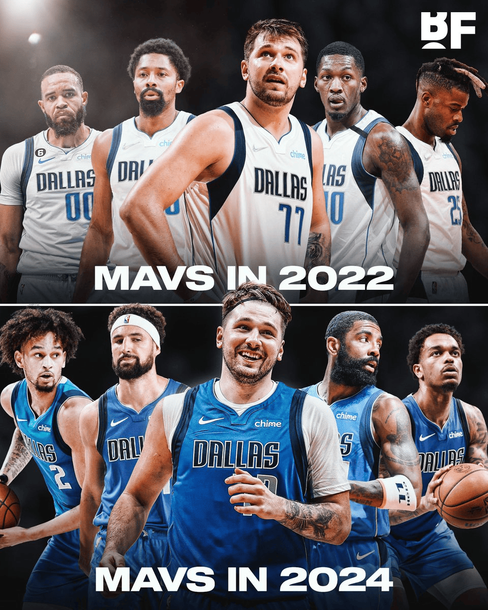 今日美媒Basketball Forever曬出了獨(dú)行俠2022年和今年揭幕戰(zhàn)首發(fā)對比。板全比