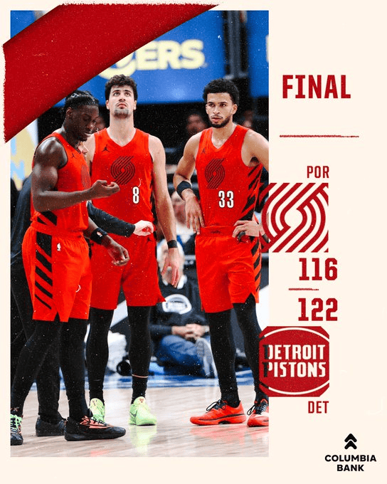 [流言板]開(kāi)拓者發(fā)布全場(chǎng)比分海報(bào):今日不敵活塞,戰(zhàn)績(jī)降至9勝14負(fù)